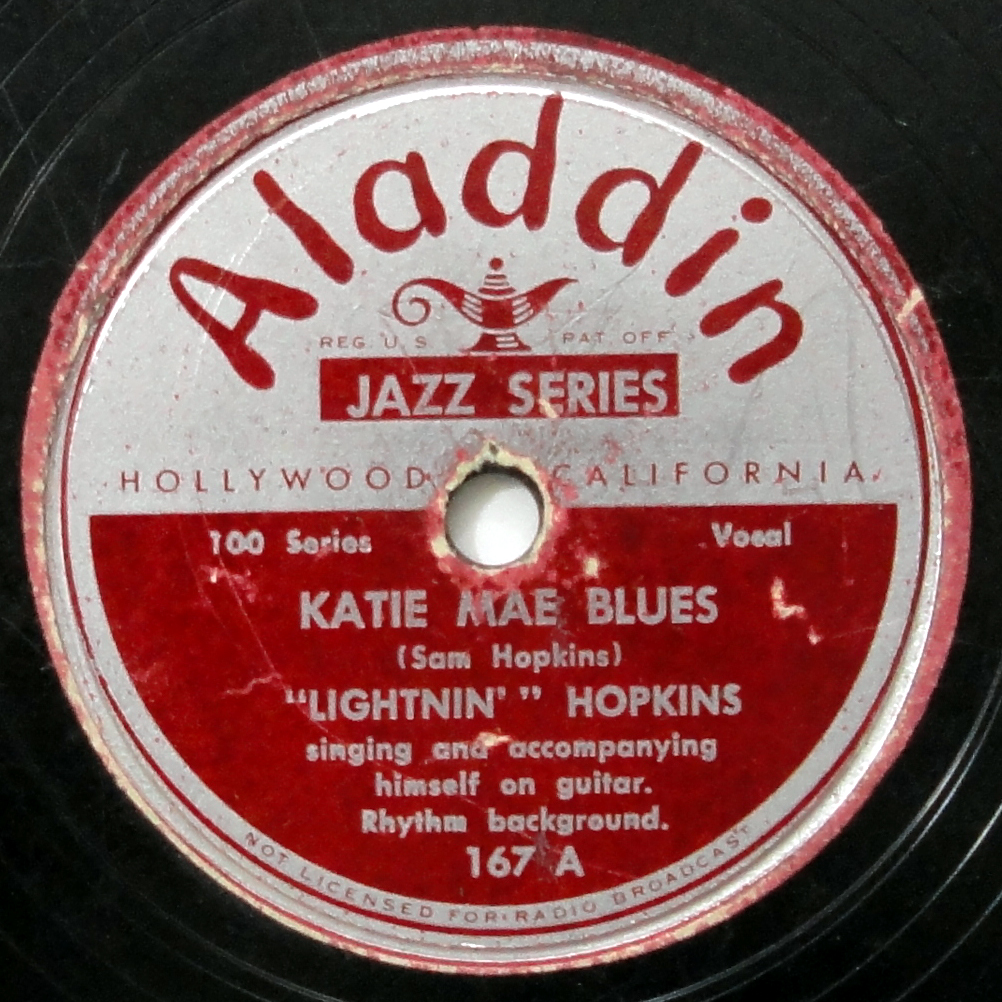 “Katie Mae Blues,” Lightnin’ Hopkins. I’m pretty sure that this was Hopkins’s first single, cut in 1946. Having a copy on Aladdin is just silly cool to me, even if it isn’t in the best of shape. You can hear the song here.