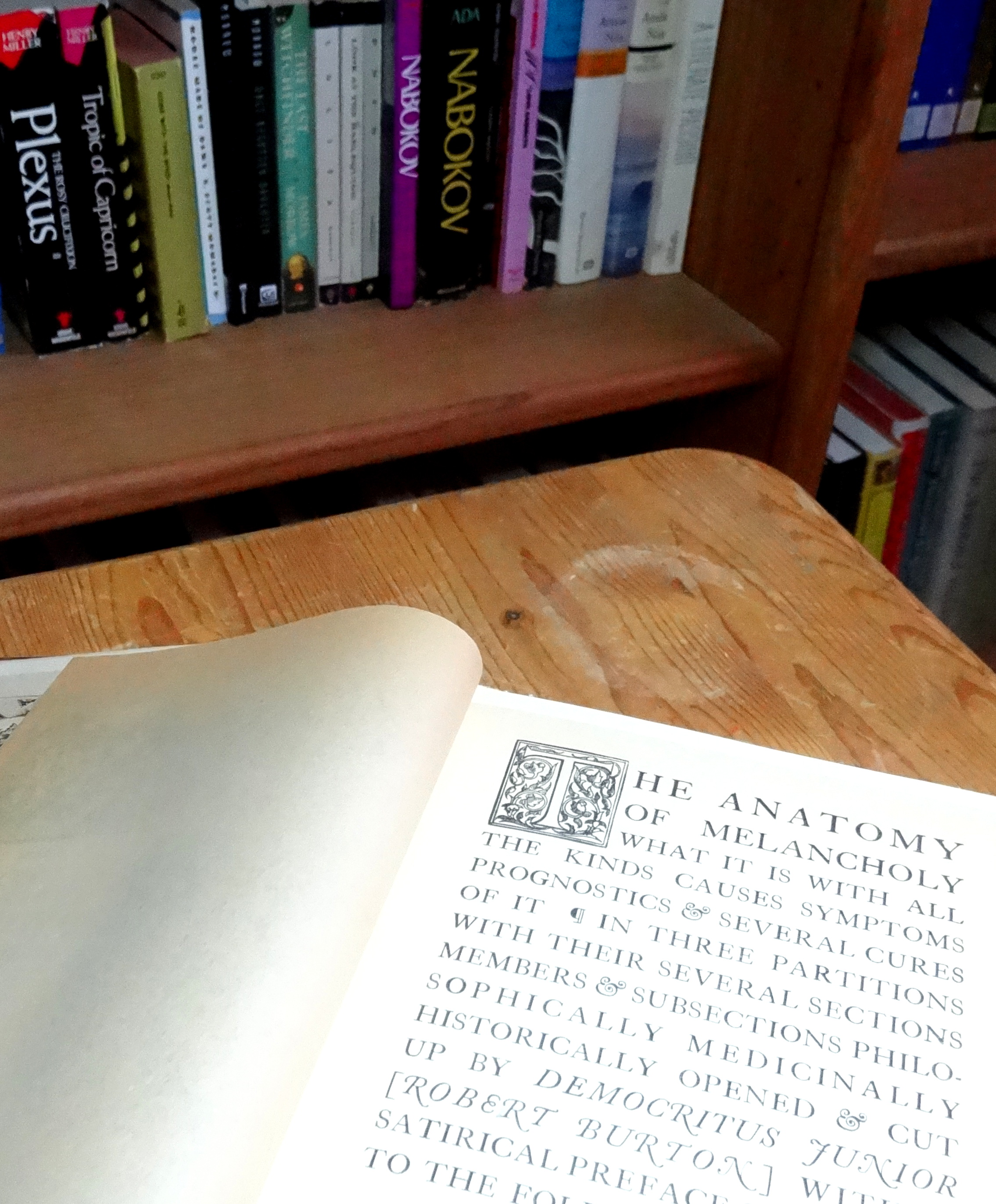 At one point I owned five copies of The Anatomy of Melancholy.  At the time I thought that I would be teaching English someday, but that didn’t work out.  I just don’t see it, a friend of mine said.  I don’t think you’d be a very good teacher.  But maybe that’s not why I owned five copies anyway.  Maybe it was just my broken brain teetering on hoarding, clinging to flotsam.  I’m down to one copy, by the way: a 1907 edition that has never been read, it’s quarto pages never cut at the top.
