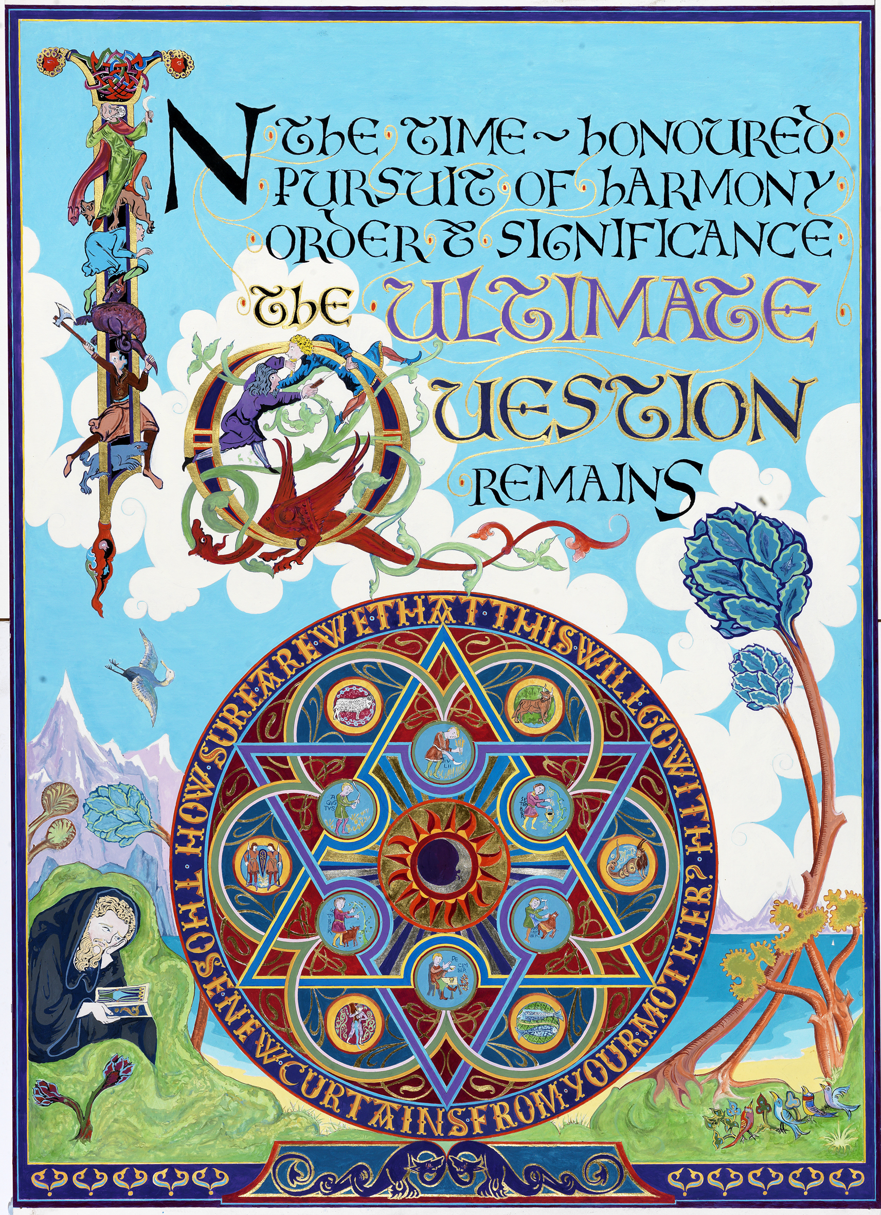 I suppose it’s exactly those dual strands that come together in one of my most recent pieces, “The Ultimate Question.” The catalyst for the painting was visiting the breathtaking exhibition of Illuminated Royal Manuscripts at The British Library a while back. It confirmed to me that those boys slaving over a hot quill in their scriptoria matched anything and everything visual that had come before or has come after them. Their design sensibility, letterforms, linear mastery, colour sense, and the sheer genius of their visual literacy & inventiveness define everything that I’ve ever been drawn to in art.