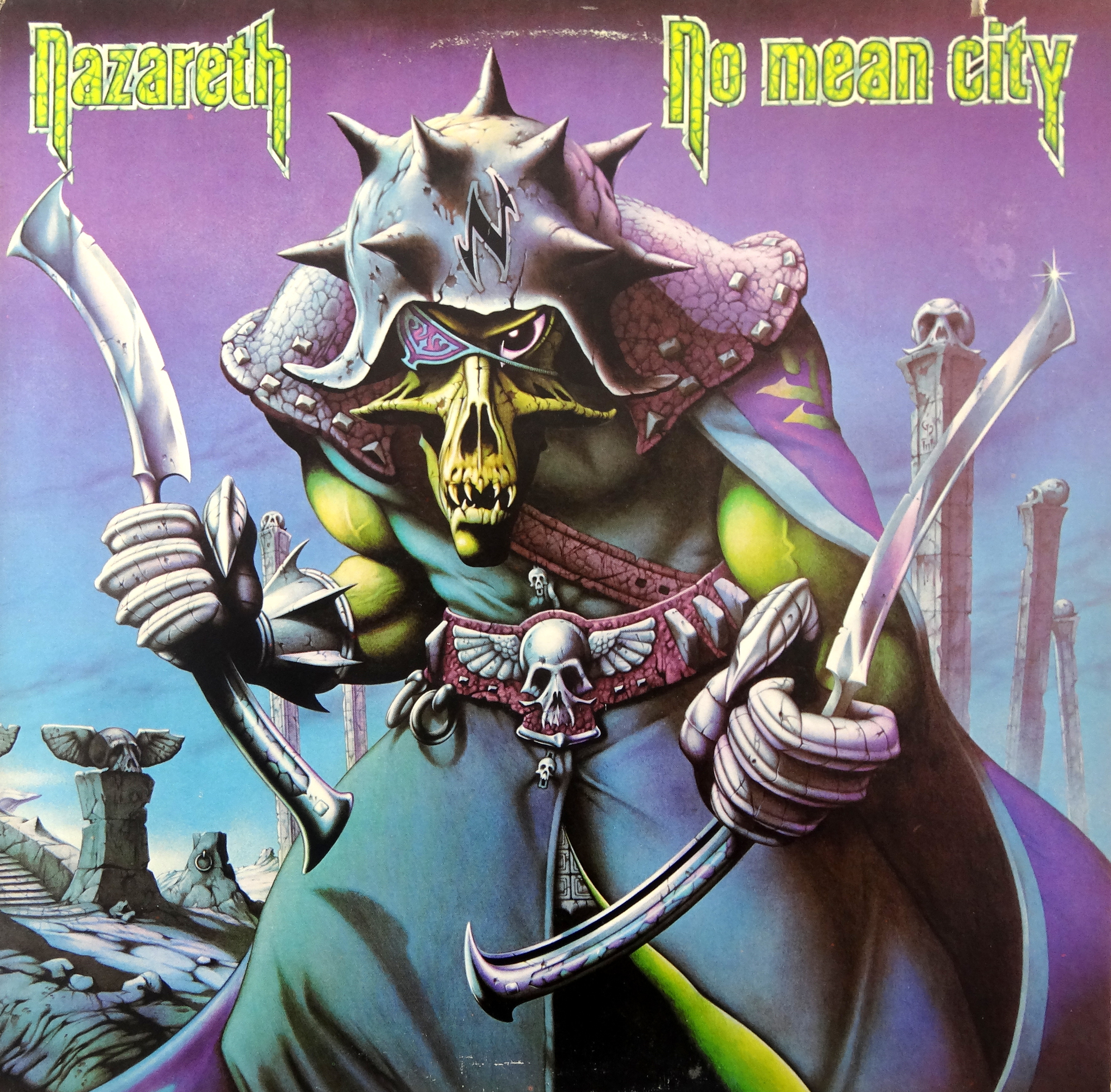 No Mean City was supposed to capture the essence of a novel by the same name, written about gang warfare, rampant in Glasgow, Scotland, during the depressed years of the 1920s and 1930s. When I had completed a couple of pencil sketches, I flew from Bristol up to the Isle of Man, where I was greeted at the airport by one of the band, who proceeded to whisk me off in a sports car (open-topped) to meet the rest of Nazareth at their residence.