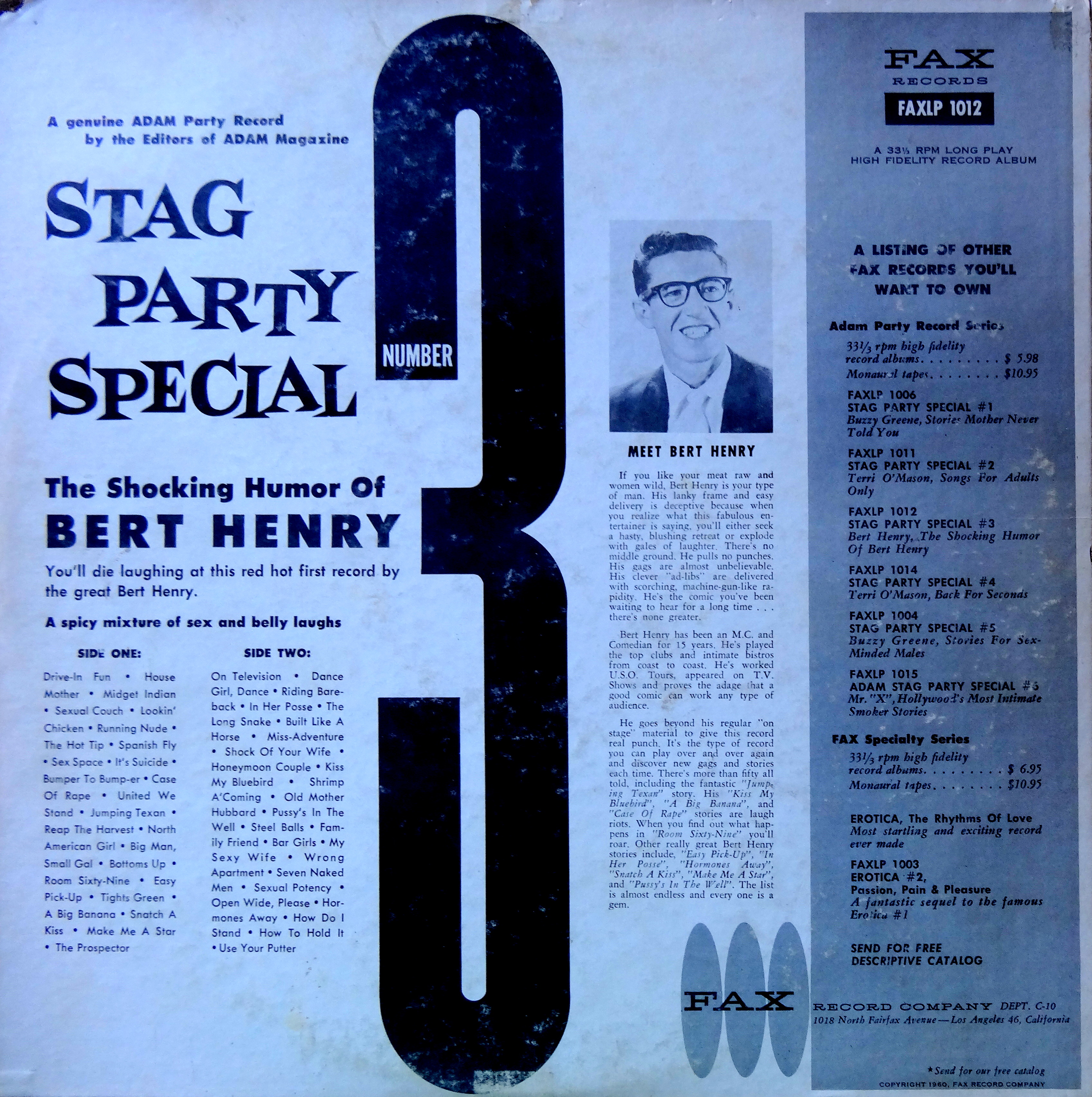 Adam Stag Party Special 3 FrontOh, the party record. It’s such a foreign idea, inviting over a bunch of guys, busting out the highball glasses and the Vienna sausages stabbed with ornamental toothpics and listening to an album full of dirty jokes.
