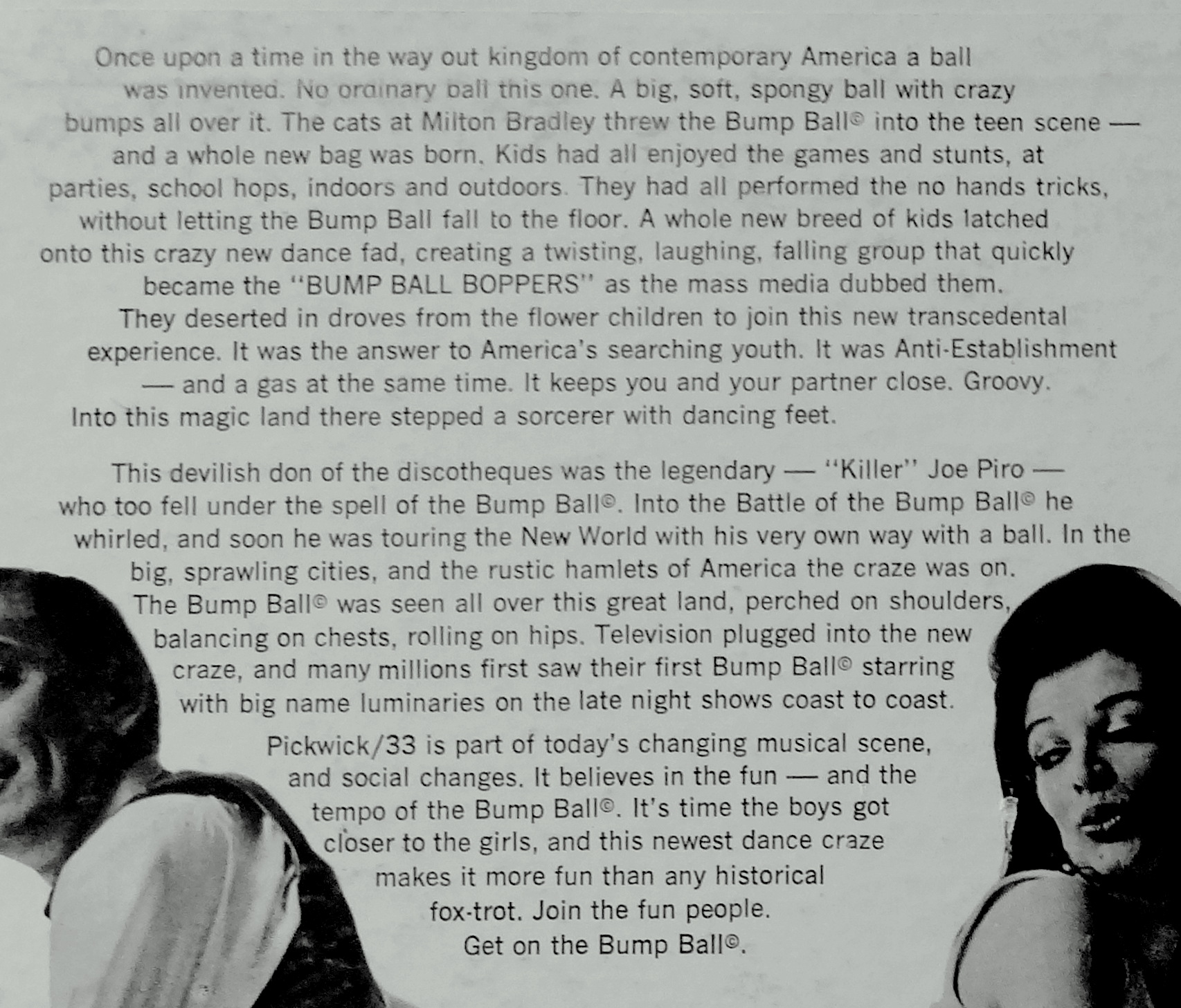 Bump Ball was either Milton Bradley’s attempt to sell what kids do for free with a balloon, or it was their effort to give kids in 1968 a chance to feel each other up. The idea of the game was to toss the ball into the air, trap it between your partner and yourself, then keep if from hitting the floor as long as possible. Free with every Bump Ball purchase was a 45 of the following song: