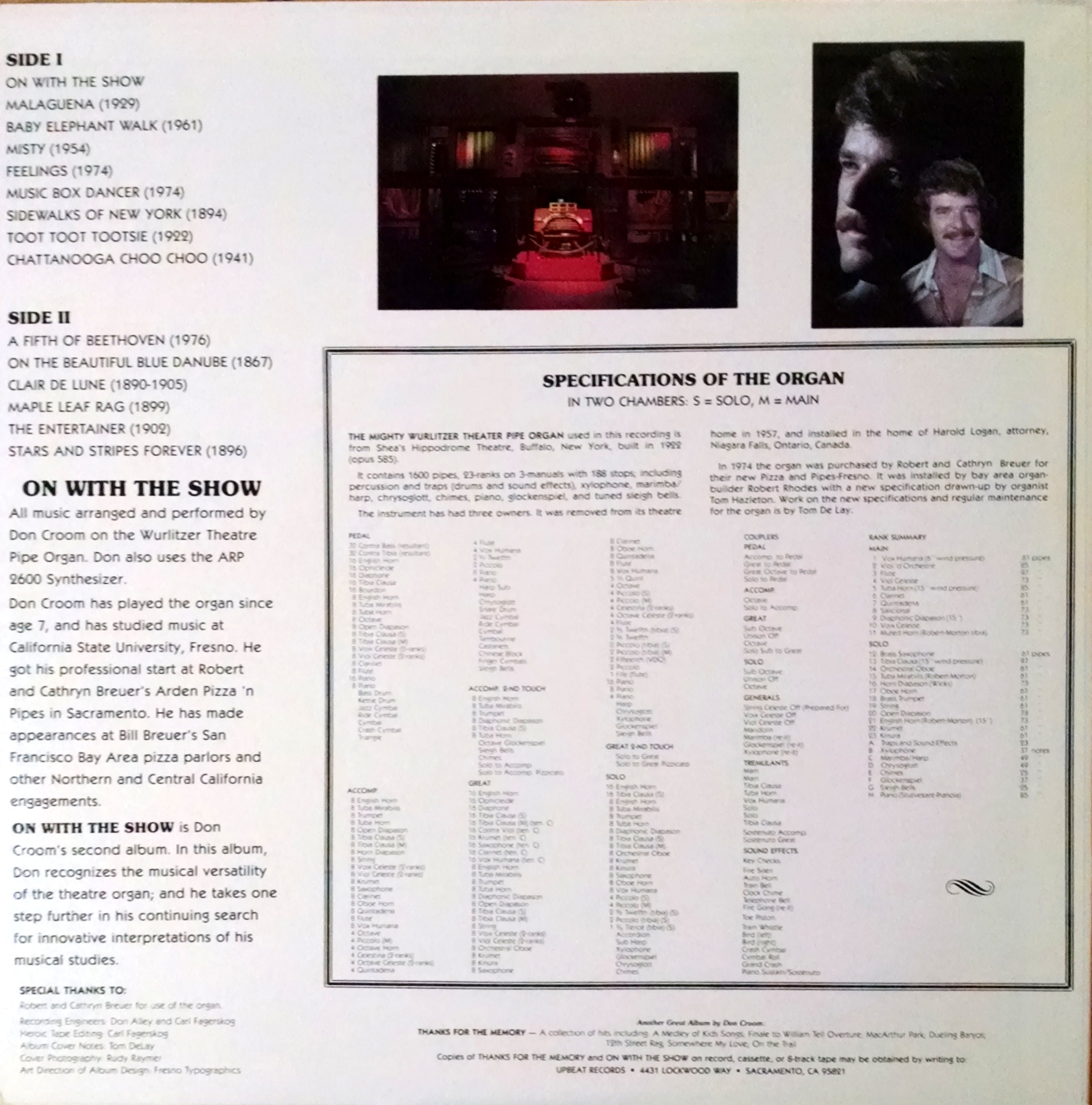 On With the Show captures The Croom in all his glory on the pipe organ at a Fresno, California pizza restaurant. He rocks all the swingin’ hits that the kids today love: “Baby Elephant Walk,” “Misty,” “Feelings,” and of course, “A Fifth of Beethoven.” You might think that if you’ve heard one disco Beethoven cut played on a pizza restaurant pipe organ you’ve heard them all, but that’s because you’ve never heard Don Croom make it his own.