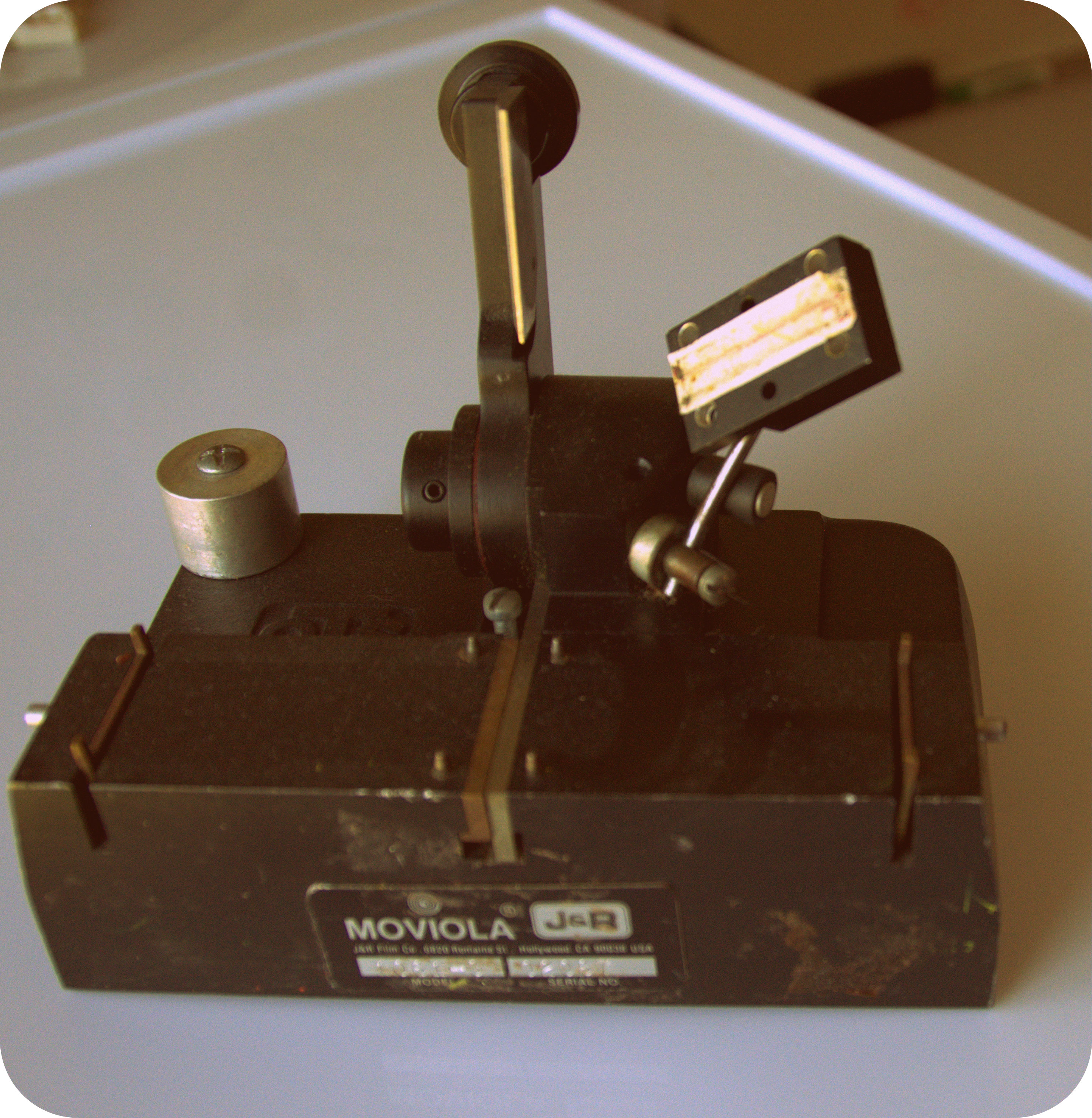 In the center of our benches rested the synchronizers, a heavy chunk of metal painted a metallic pea green that housed an axle and a little counter similar in appearance to an old car odometer. The axle held several gears designed to work with the perforations, or “perfs,” on the edges of the film. Each set of two gears (one for either edge of the 35mm film) was called a “gang,” so for example a two-gang could handle one reel of film and one reel of sound.
