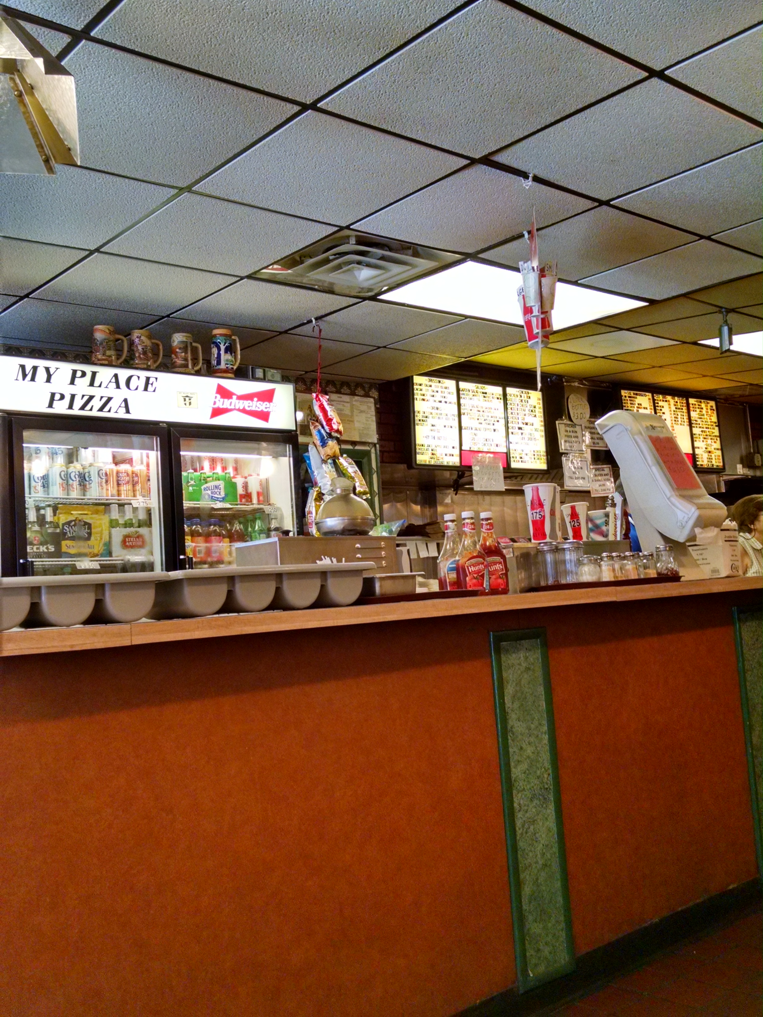 Two ballet posters hang on the wall. The ceiling is low, made of stained acoustic tiles, and the booths are covered in lithographed wood laminate like a fast food restaurant circa 1982. A guy sporting both a muscle shirt and a mullet just hit the counter. Beside me a couple carries on a loud conversation in Spanish. Behind the counter someone yells, “Slice!” and a mail carrier jumps up from one of the booths to fetch her lunch.