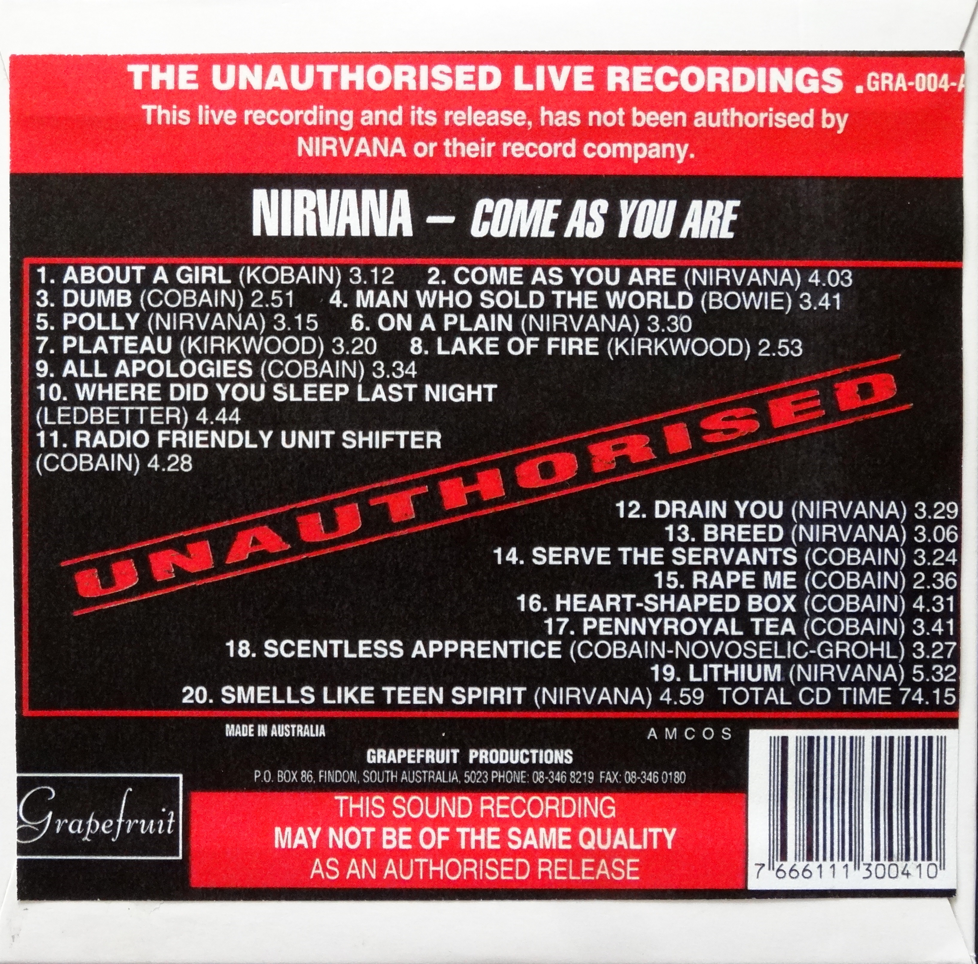- Come As Your Are Unauthorized: There are a few boots named “Come As You Are.” This one is pretty common, and is pulled from the SNL rehearsals, the MTV Unplugged gig, and a 12/13/1993 Seattle gig at Pier 48 for a show called MTV Live and Loud. Value: $5-8