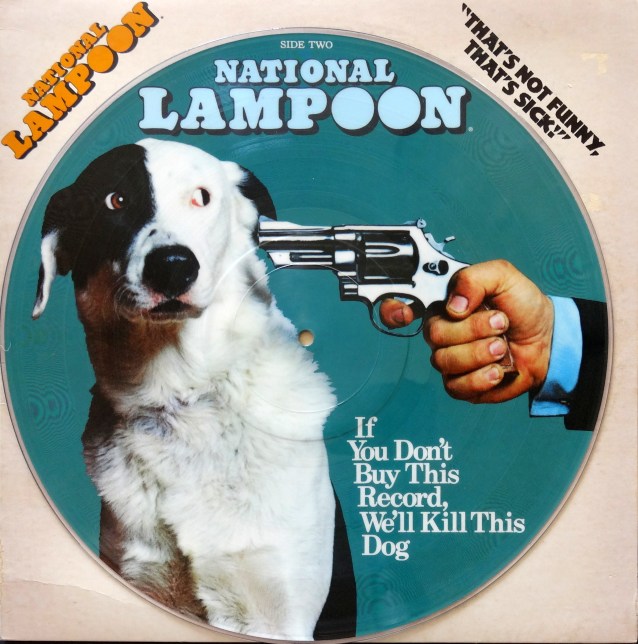 The Lampoon released several comedy albums, too, including this 1977 compilation of sketches from The National Lampoon Radio Hour.  If you love picture discs, this one is a must have if for no other reason than the reworking of their infamous January 1973 “If You Don’t Buy This Magazine, We’ll Kill This Dog” magazine cover.