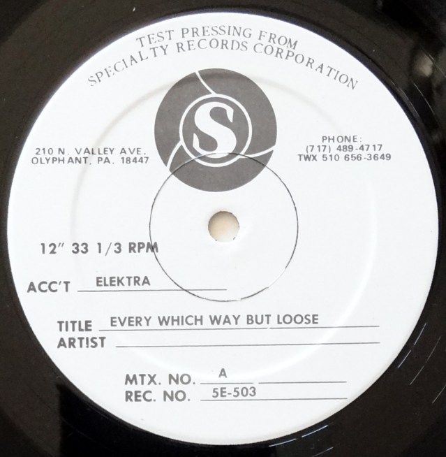 The Every Which Way But Loose soundtrack is a dollar bin album, but test pressings always go for more than their commercially available brethren. Let’s call this one 5-10 bucks. Happy hunting.
