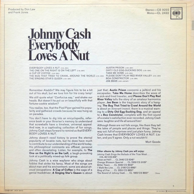But I do associate Davis with novelty records like releases from Homer and Jethro or Sheb Wooley, which is precisely what Cash was after on Everybody Loves A Nut. Yep: If you’re looking for a Johnny Cash comedy record this is the one.