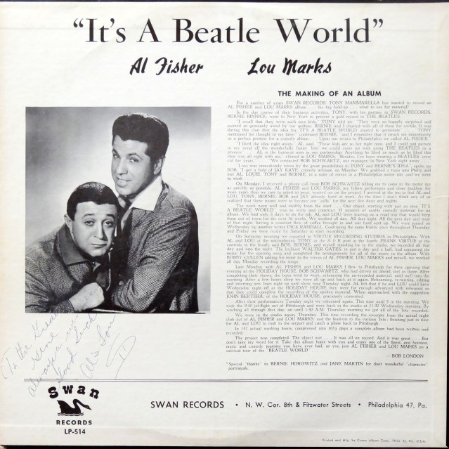 It was Swan’s only chart topper, but that didn’t keep them from trying. Everybody was trying to cash in on Beatlemania in ’64, after all, and I’d imagine that Swan probably felt uniquely positioned to make a little extra Beatle bank. Not only were they the “She Loves You” label, but being a Philly based company they had access to local comedy legends Fisher and Marks.