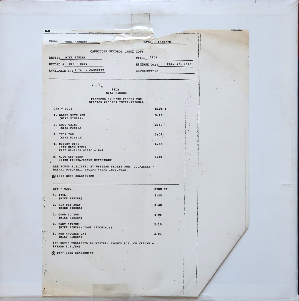 So that’s where you probably know Pinera from, but what we’re looking at here is a test pressing of the artist’s first solo album, 1978’s Isla. It’s a cool record, very much a product of its time. It’s a bit all over the place, too, but that’s not necessarily a bad thing. “Alone With You” sits in that space separating, say, soft jazz and disco, and “Good Thing” has a kind of Andrew Gold vibe. But it’s the album’s title track that’s the real keeper, a sort of black lights and doobies Robin Trower freakout that must have sounded great blaring from a Chevelle’s Sparkomatic tape deck: