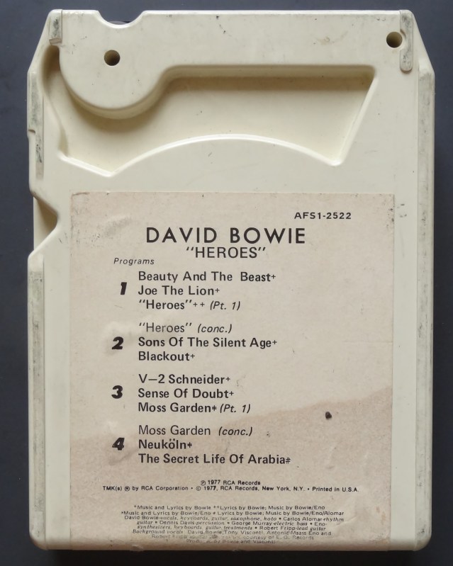 Anyway, you can expect to pay maybe 2-3 dollars for a Heroes 8-track in cruddy condition like mine, and 5-10 bucks for the cassette. Happy hunting.