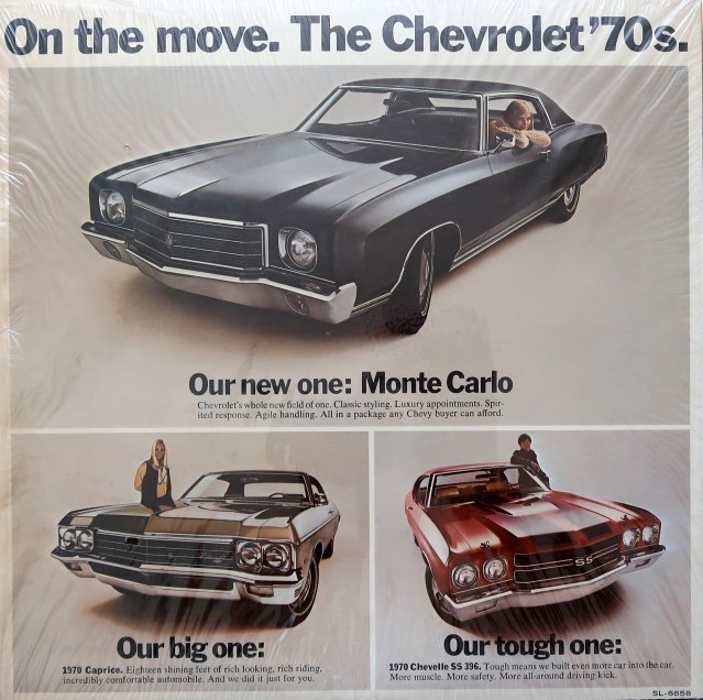 The back cover was the real prize, though. Look at those sweet rides! We were a station wagon family–my guess is that my folks brought this record home from the Chevy dealer along with our pea green Bel-Air wagon. What I wouldn’t have given for my dad to spring for that red Chevelle Super Sport pictured on this album cover.
