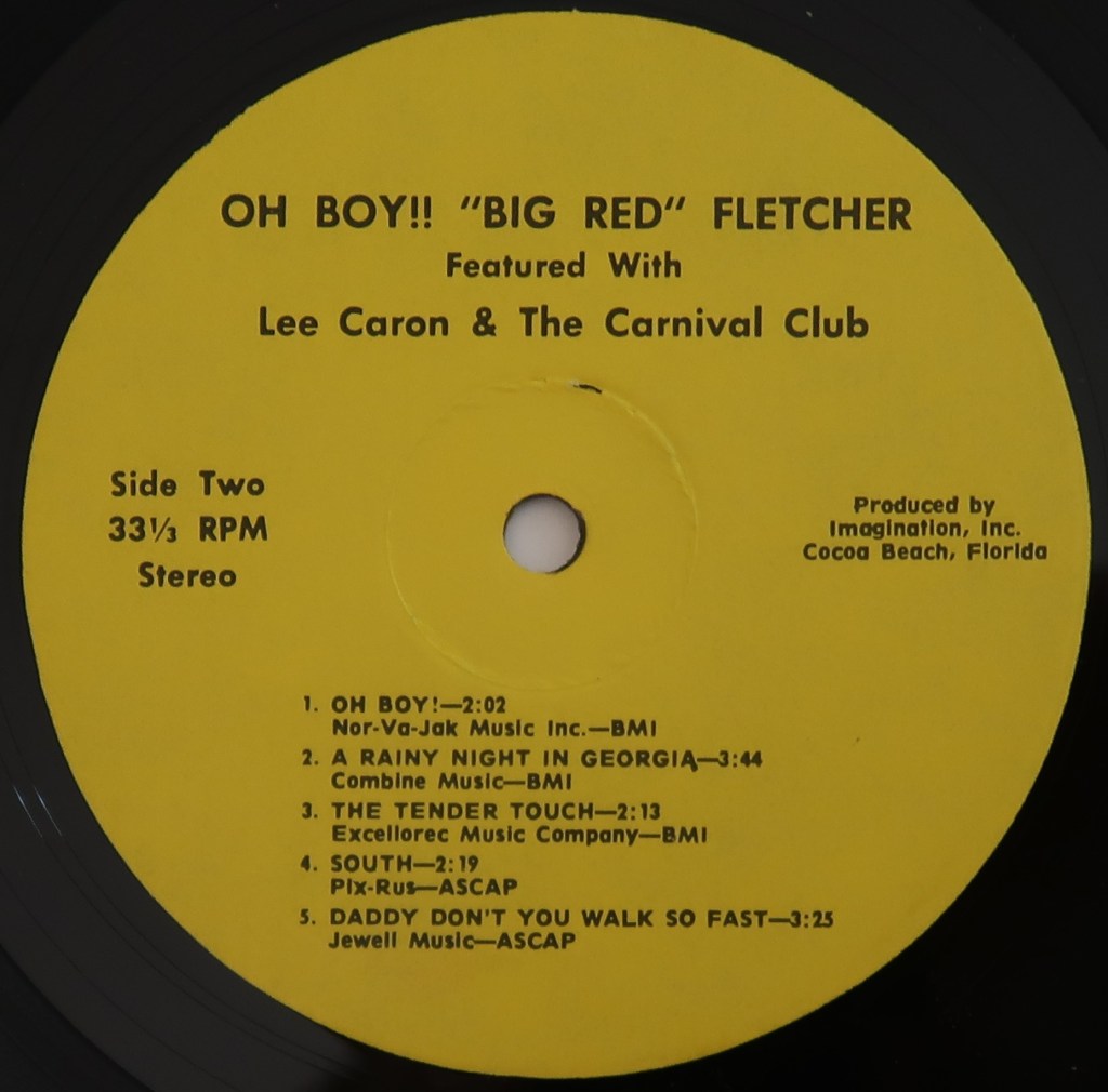 Take Big Red Fletcher’s Oh Boy!!, for example, found tucked between 101 Strings and Perry Como in an antique mall in Montgomery, Alabama, and purchased entirely for that glorious amusement park caricature album cover. Lee Caron? Big Red Fletcher? Never heard of them, nor have I ever heard of the Carnival Club in Cocoa Beach, Florida, and not much makes me happier than mysteries spinning at 33 and a third.
