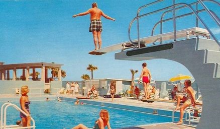 My cousin leaps from the high dive, an Evel Knievel-sized stunt in my shallow end estimation. Neither father nor uncle appears phased by this brave and beautiful feat; in fact, they don’t even seem to notice what just happened. And then a muscular hand grabs me by the “I’m A Little Devil” and carries me like a piece of Samsonite to the deep end of the pool, where I swing in the air a couple of times before I’m launched like a bag of garbage. I break the surface of the water roughly where my cousin vanished upon springing from the high dive.